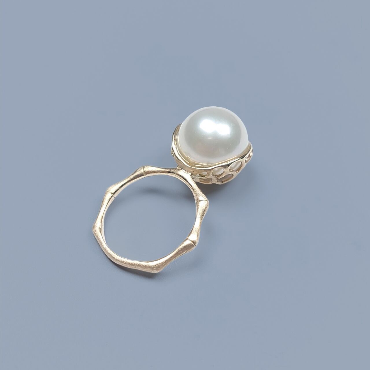 古来より伝わる吉祥文様の青海波、波をモチーフとされた青海波模様を透かしにアレンジしてパールを包みました。リングの腕部分はバンブーをモチーフに。