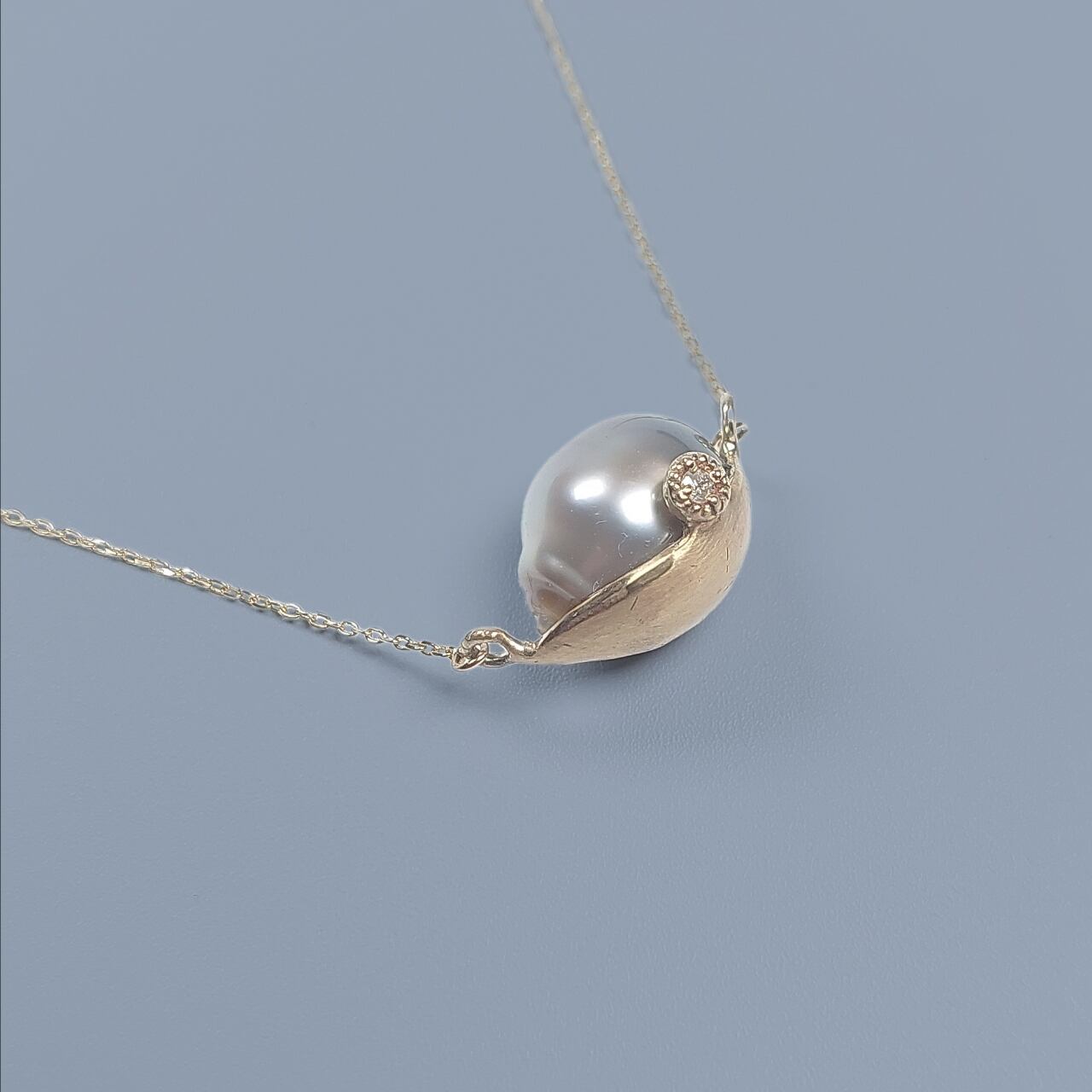 雫型のバロックパールをまるでゆりかごのようにゴールドが優しく包み込む