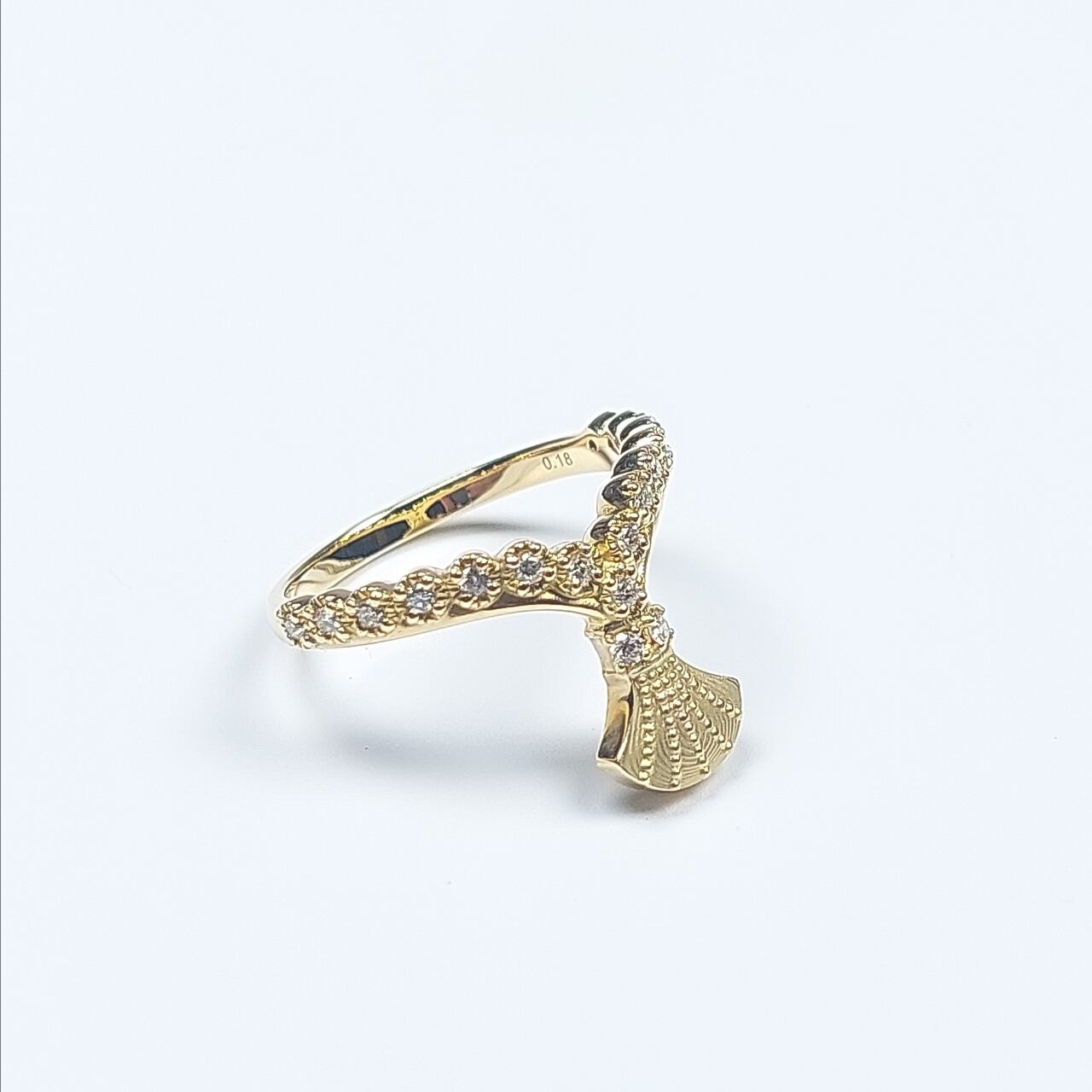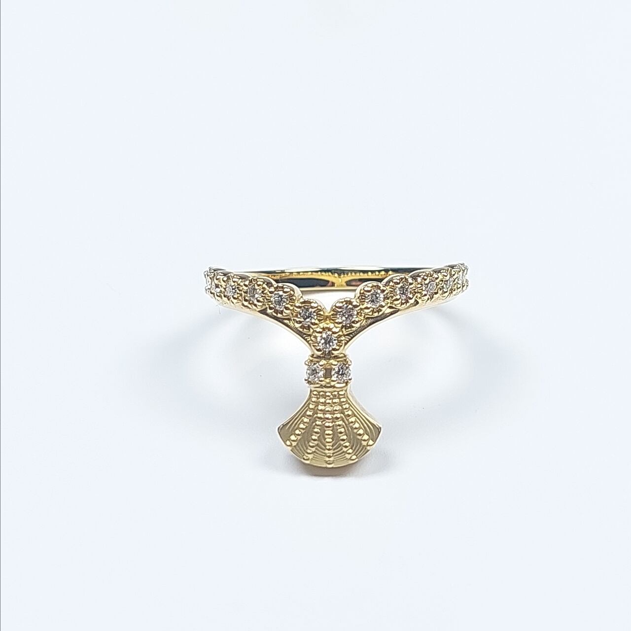 Incorporating traditional motifs such as fan shapes, this ring harmonizes classical aesthetics with a modern sensibility. Its sparkling diamonds and timeless elegance complement both special occasions and everyday moments.
