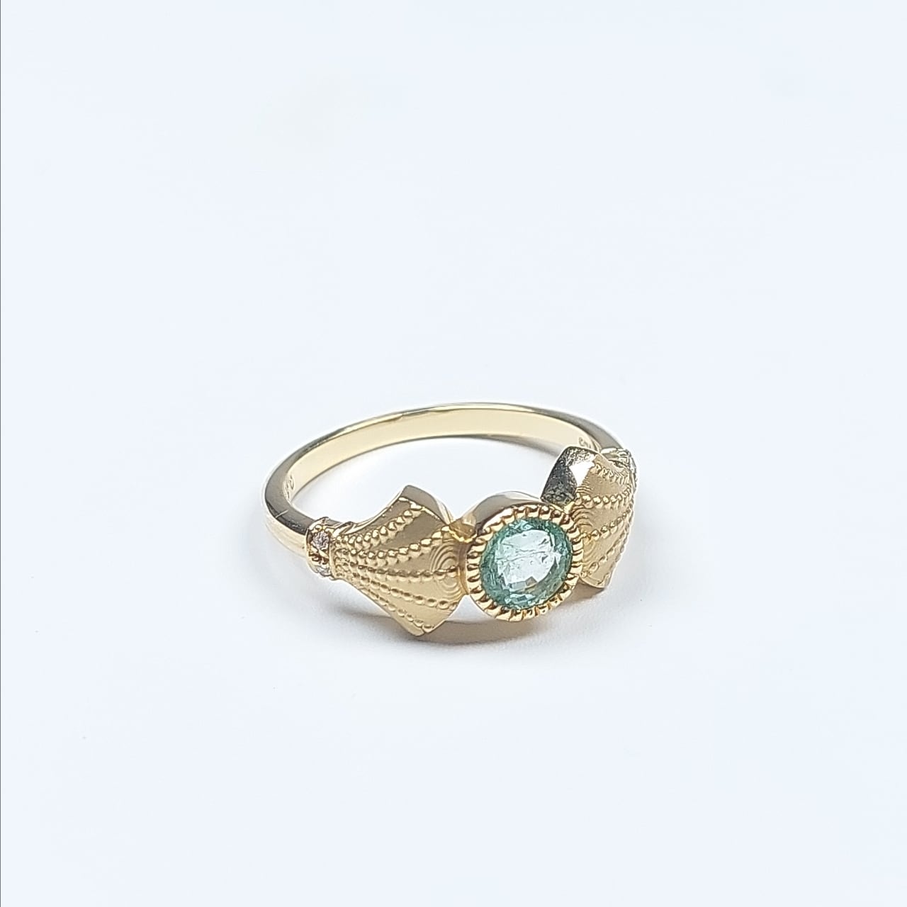A ring inspired by the traditional fan-shaped motif, where classic aesthetic sensibilities harmonize with modern design. The fresh mint-green emerald is paired with the sparkle of diamonds, creating a timeless elegance that complements both special occasions and everyday life.
