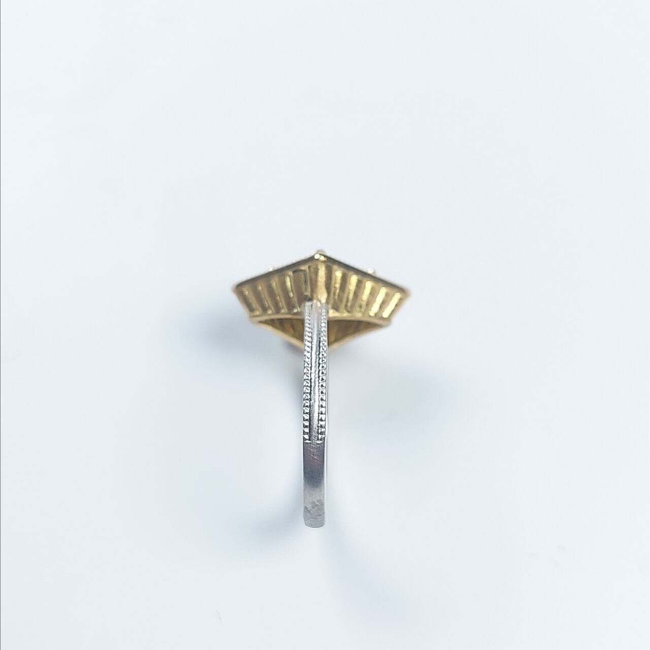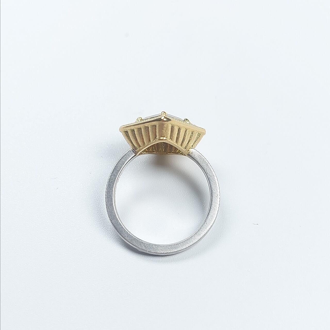 Inspired by ancient architecture, this ring carries a classical air, crafted in a rich blend of K18 and platinum for a textured finish. At its center lies a Salt & Pepper diamond—named for its unique mix of inclusions—encircled by warm brown diamonds, creating a subtle yet captivating brilliance.